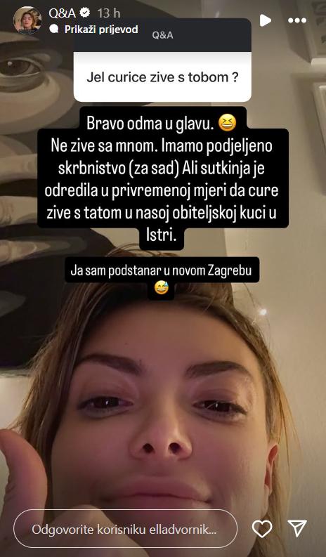 Na pitanje jednog pratitelja: “Žive li curice s tobom?”, Ella je otvoreno odgovorila: “Bravo, odmah u glavu. Ne žive sa mnom. Imamo podijeljeno skrbništvo (za sad). Ali sutkinja je odredila u privremenoj mjeri da cure žive s tatom u našoj obiteljskoj kući u Istri. Ja sam podstanar u Novom Zagrebu.”