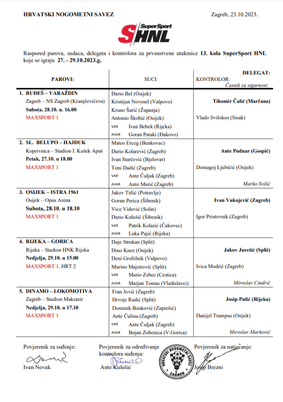 Određene su službene osobe za 13. kolo SuperSport HNL-a. Derbi kolo igra se u nedjelju od 15 sati kada će vodeća Rijeka na Rujevici ugostiti Goricu, a ogled je pripao Splićaninu Duji Strukanu iz Splita kojem će tom prilikom asistirati Dino Knez (Osijek), Deni Grofelnik (Valpovo) i Marino Majstrović (Split) dok si za VAR zaduženi Mario Zebec (Cestica) i Marjan Tomas (Vladislavci). Delegat susreta je Jakov Juretić (Split), kontrolor suđenja Ivica Modrić (Zagreb), a časnik za sigurnost Miroslav Cindrić.