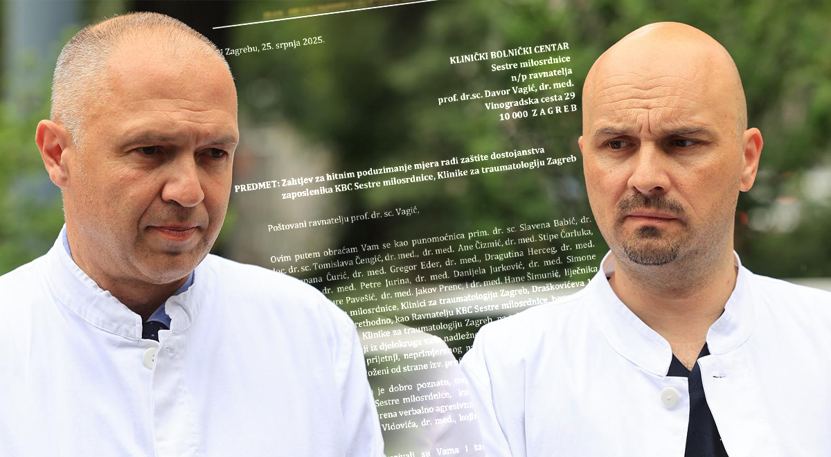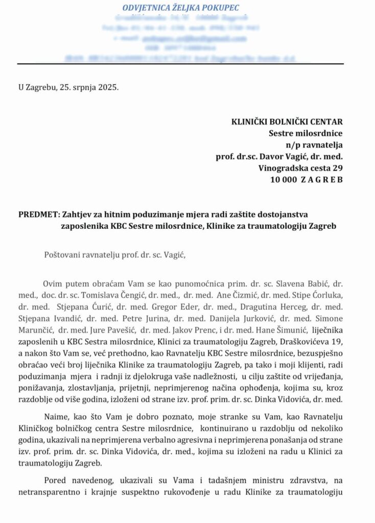 „S obzirom na sve prethodno iznesene navode, apeliramo na Vas, da kao ravnatelj Kliničkog bolničkog centra, a kao takav i odgovoran za zakonit rad Kliničkog bolničkog centra, poduzmete sve zakonom predviđene mjere i radnje iz vaše nadležnosti, prije svega u svrhu očuvanja kvalitete pružanja zdravstvene skrbi pacijentima Klinike, ali i u svrhu zaštite dostojanstva mojih stranaka, i drugih zaposlenika Klinike za traumatologiju Zagreb, i da izv. prof. prim. dr. sc. Dinku Vidović odredite drugo mjesto rada, unutar Kliničkog bolničkog centra Sestre milosrdnice.“