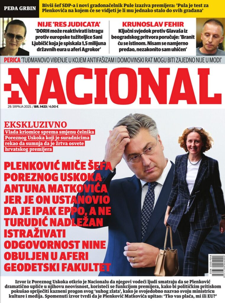 Spomenutu čistku u Poreznom Uskoku Nacional je ekskluzivno otkrio još početkom kolovoza. Tada je izvor iz Poreznog Uskoka otkrio Nacionalu da njegovi vodeći ljudi smatraju da se Plenković dramatično upliće u njihovu neovisnost, koristeći se funkcijom premijera, kako bi političkim pritiskom pokušao spriječiti kazneni progon svog ‘’suhog zlata’’, kako je svojedobno nazvao svoju ministricu kulture i medija Ninu Obuljen Koržinek.