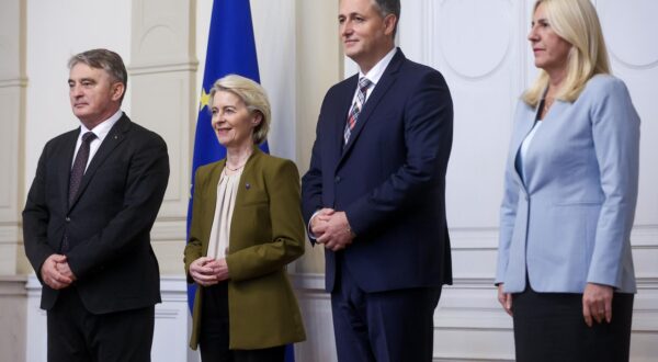 Predsjednica Europske komisije Ursula von der Leyen stigla je u utorak u Sarajevo te se u zgradi Predsjedništva Bosne i Hercegovine sastala s članovima kolektivnog predsjedništva BiH. Tijekom boravka u Sarajevu, von der Leyen će se sastati s članovima Predsjedništva BiH – Željkom Komšićem, Denisom Bećirovićem i Željkom Cvijanović, kao i s predsjedavajućom Vijeća ministara … Nastavi čitati POKLONILA SE ŽRTVAMA SREBRENICE Von der Leyen u Sarajevu, sastala se s članovima Predsjedništva BiH