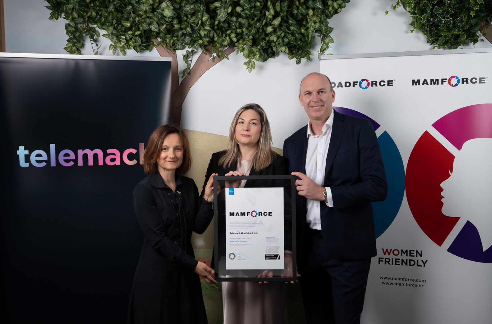 Telemach je postao nositelj MAMFORCE standarda u kategoriji BASIC, čime je potvrđena njegova predanost stvaranju poticajnog radnog okruženja temeljenog na obiteljskoj odgovornosti, ravnoteži između poslovnog i privatnog života te rodnoj ravnopravnosti. Kroz neovisni evaluacijski proces, kompanija je demonstrirala snažnu usmjerenost na dobrobit svojih zaposlenika i posvećenost kvaliteti u upravljanju ljudskim potencijalima. Certifikat MAMFORCE standarda predsjedniku Uprave Telemacha, Adrianu Ježini, uručila je Diana Kobas Dešković, direktorica konzultantske tvrtke Spona Code, koja provodi neovisne evaluacije i certifikacije organizacija u području upravljanja ljudima.