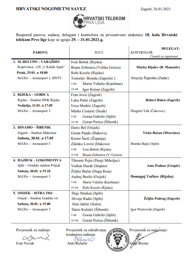 Subota od 17:05 je rezervirana za utakmicu Dinama i Šibenika za koju je delegiran Dario Bel iz Osijeka dok Hajduk istog dana od 19:10 na Poljudu dočekuje Lokomotivu u dvoboju koji je pripao Tihomiru Pejinu iz Donjeg Miholjca.