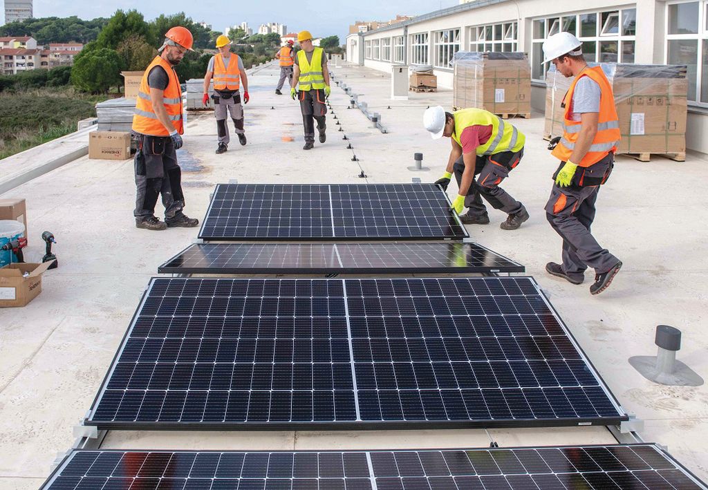Postavljanje solarnih panela na Industrijsko-obrtničku školu Pula; solarne elektrane postavljene su i na Školu za turizam, ugostiteljstvo i trgovinu te na TSŠ ‘Dante Alighieri’. FOTO: Istarska županija